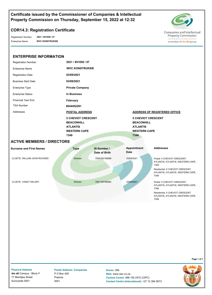 Although WVC Konstruksie was only established in 2021, its Directors and